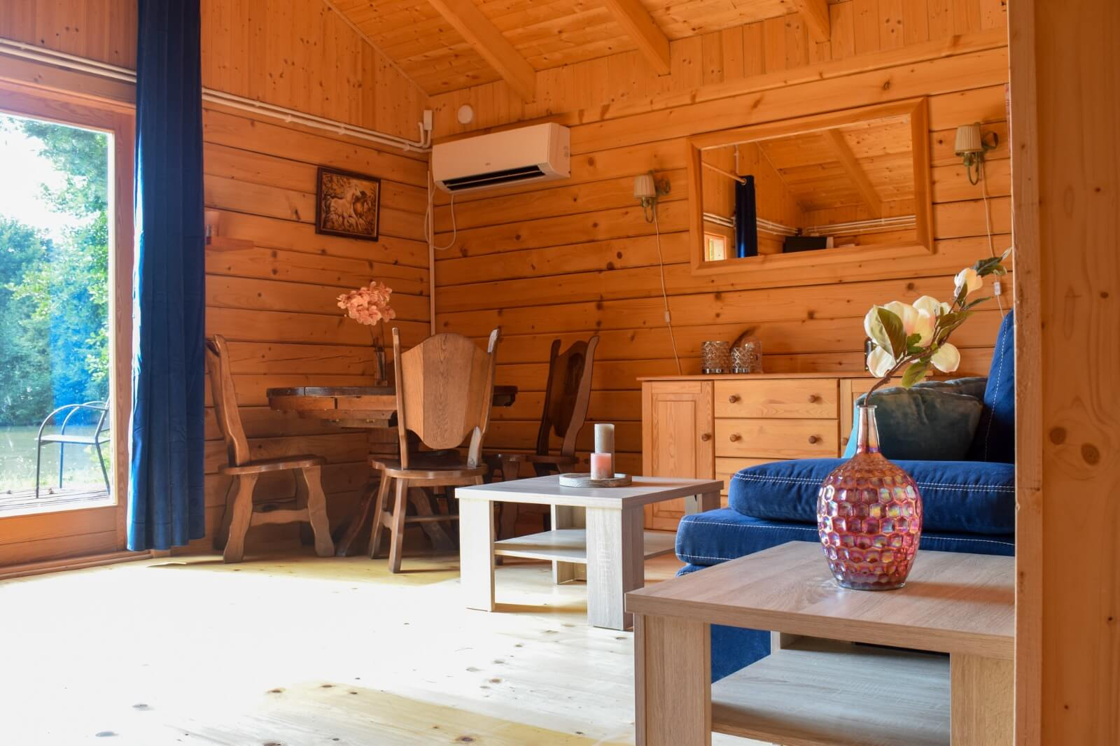 Ten dom nad jeziorem to Twoje idealne miejsce na samotność i wędkowanie, położone na brzegu prywatnego zbiornika wodnego. Główny domek oferuje przytulny salon z kuchnią, sypialnię dla dwóch osób i nowoczesną łazienkę, a także taras z pięknym widokiem na wodę. Dom jest w pełni wyposażony dla komfortowego pobytu, w tym klimatyzację, kuchnię, telewizor, a nawet frytownicę powietrzną.